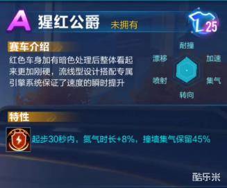 当然,在竞速排位赛中也同样有用,赛车的强大动力让赛车可以更好的领跑,如果玩家能够在起步阶段取得领先的优势,领先还是较为容易的,而且猩红公爵在一定程度上提高了玩家的容错率,保留氮气避免玩家因为失误失去整个氮气。