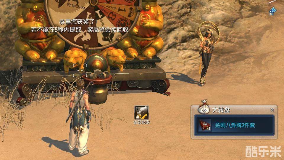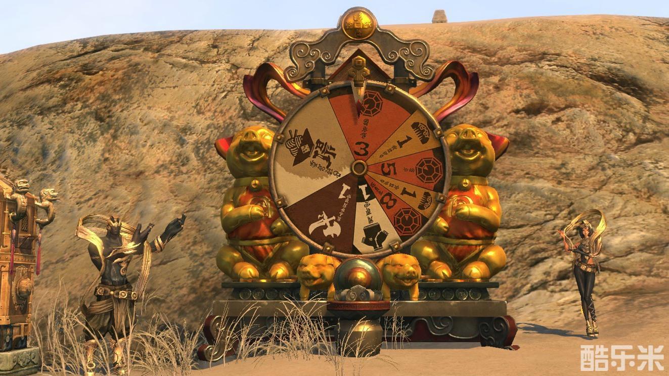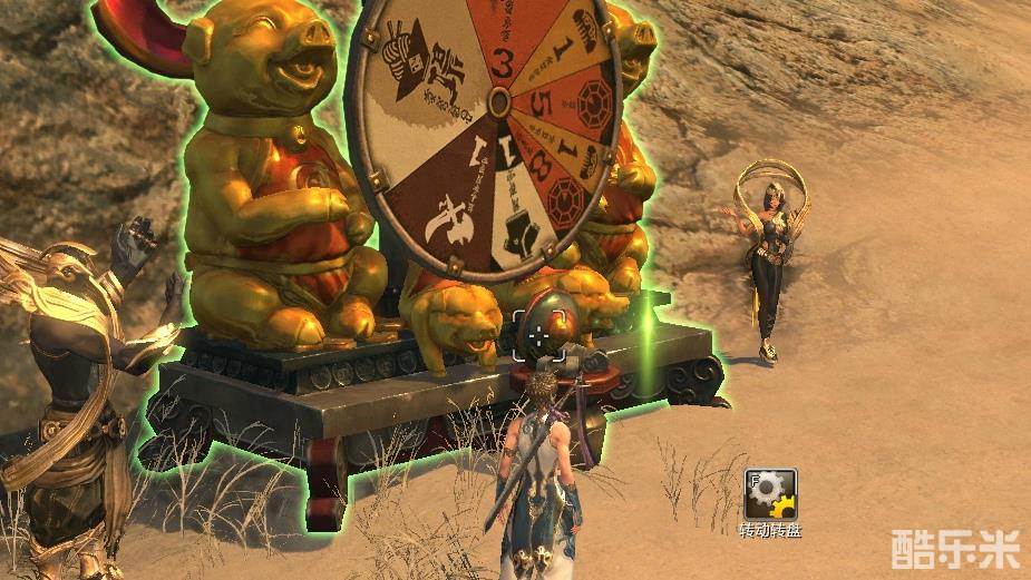| 位于大漠金刚罗汉的转盘 通过消灭野外首领获得的精气可以在快乐大转盘这里抽奖。 每次使用需要消耗1个精气,玩家会从武器、八卦牌、服装等奖励中随机获得。 | |||||||||||||||||||||||||||||||||||