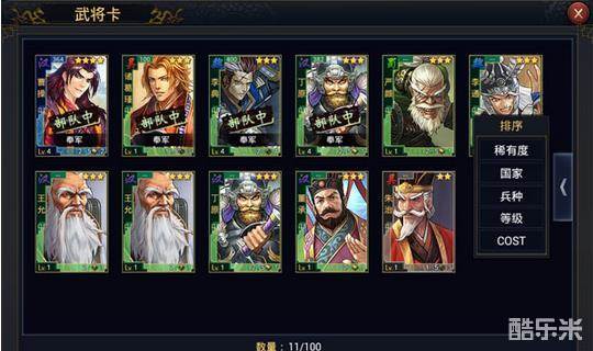 2)点击右侧箭头,可将武将卡按不同方式(稀有度、国家、兵种、等级和cost)再次排序。值得一提的是,已经位列部队的武将会始终置顶显示。