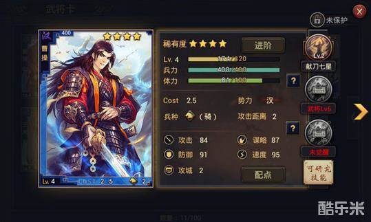 3)点击武将卡牌可查看该武将卡详情,并对武将进行进阶、属性点分配、技能强化等操作。游戏中武将谋士的属性种类非常丰富,其中阵型、攻击距离、兵种是不可变更的基本属性,攻击、防御、谋略、速度、攻城等属性可以通过加点来升级,技能可以通过消耗技巧值来学习和升级。