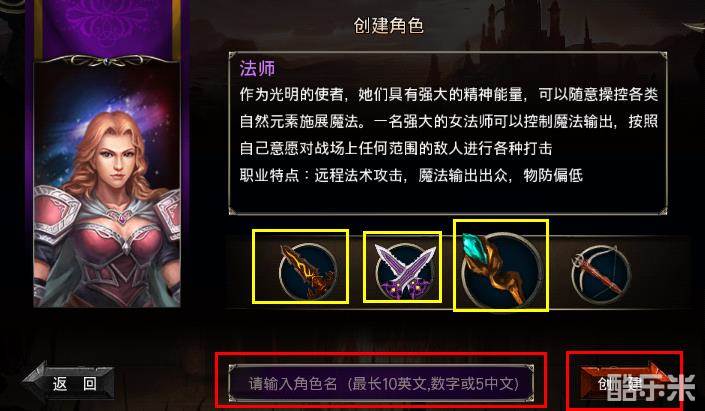3、选择您喜欢的职业 (可分别点击下图黄框标注的武器图标进行职业切换)