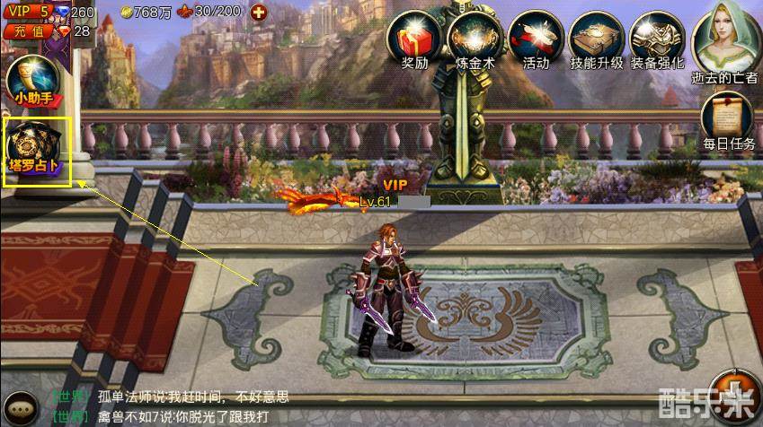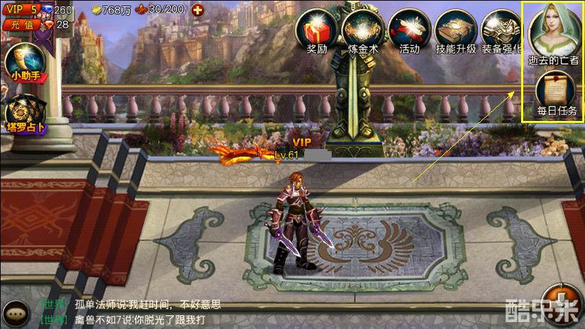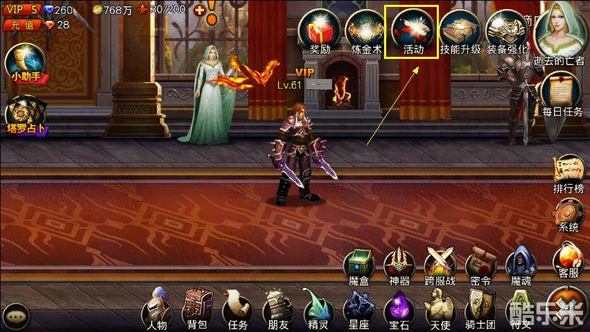 上图标注的是任务系统,点击右上角任务按钮,即可跟进您当前的主线、支线任务(任务按钮带有自动寻路功能哟,任务途中迷路了,就点它吧!)。