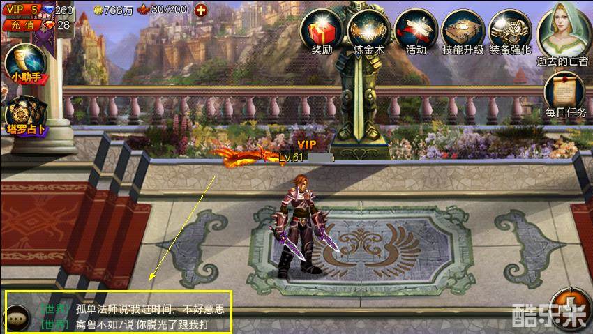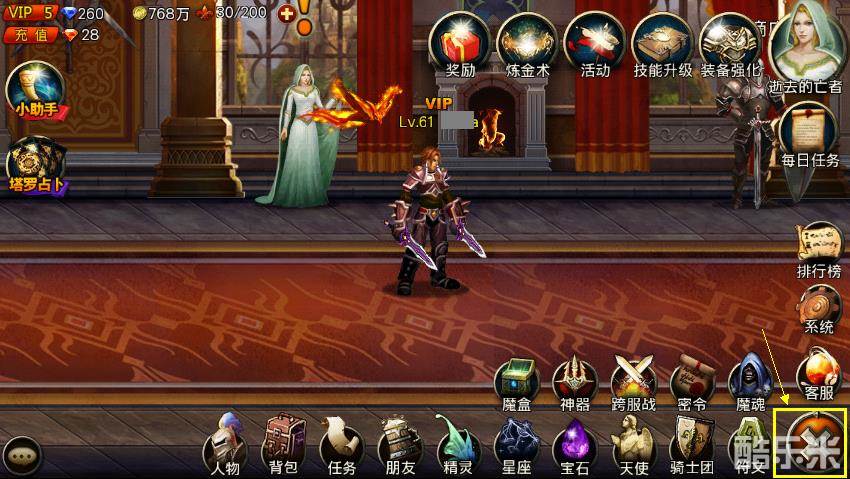 上图所标注位置为游戏中的货币(包括蓝钻,红钻,金币),其中,是玩家的VIP等级,可点击进行查看。