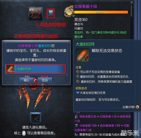 | 处于不可交易状态的至尊级装备可以使用与武器等级对应的封印符进行再次封印,封印后,武器变为可交易状态。在提炼界面中可以使用该功能。重新封印后,武器中已镶嵌的宝石将会消失,随机效果、宝石孔与成长阶段都将会重置 | ||||||||||||||||||||||||||||||||