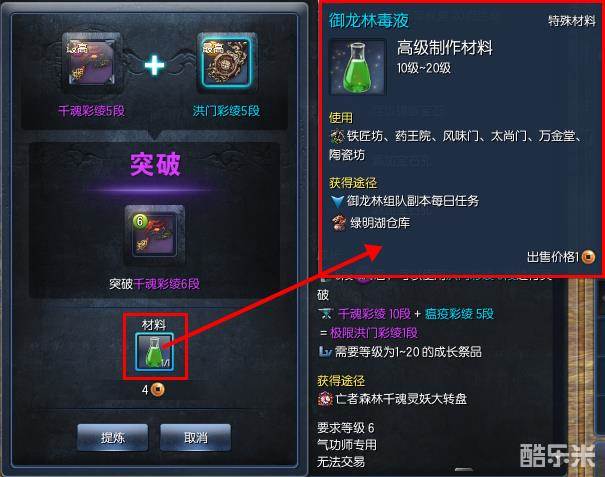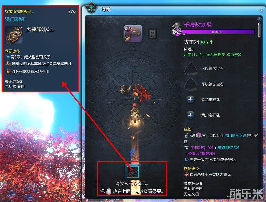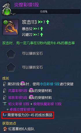 | 突破祭品的信息可以在成长装备的装备信息中看到,也可以在达到"5段max"时,在提炼界面的祭品装备框中查看更详细的信息,包括突破祭品获得方式。 |