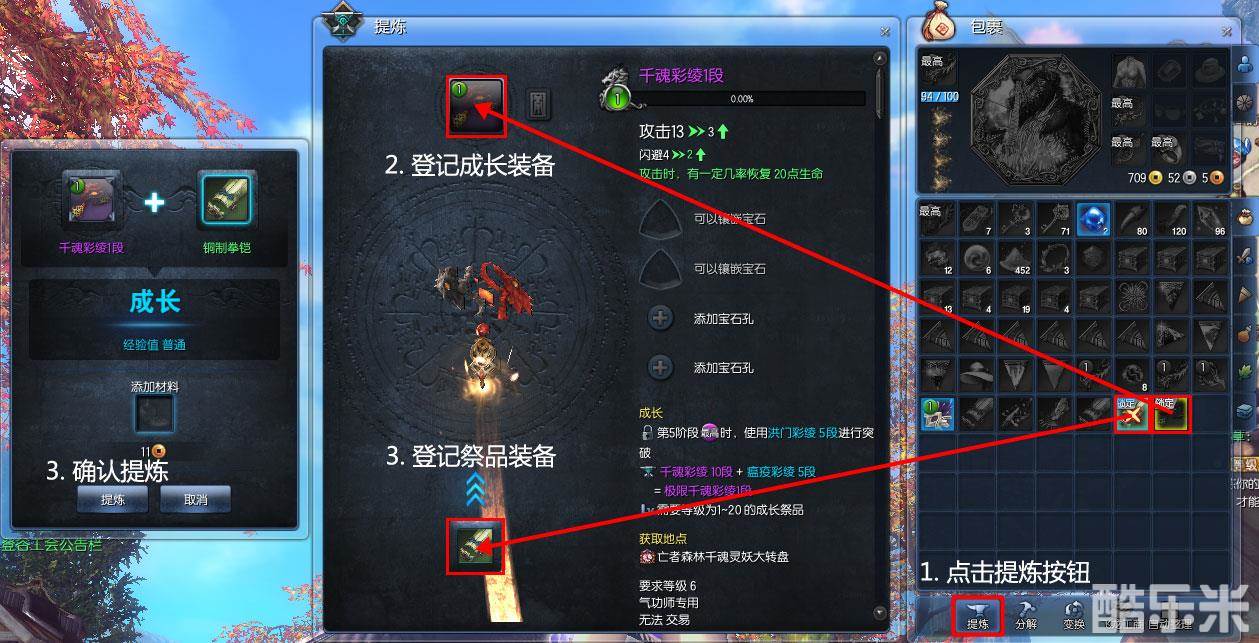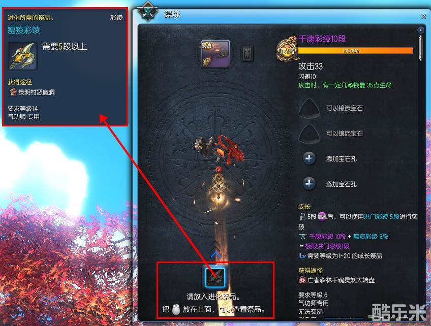 | 当成长装备成长至"10段"时,需要使用指定进化祭品进行进化,进化后可以获得一件全新的装备,拥有更大的成长空间。 进化祭品的信息可以在成长装备的装备信息中看到,也可以在达到"10段"时,在提炼界面的祭品装备框中查看更详细的信息,包括祭品祭品获得方式。 |