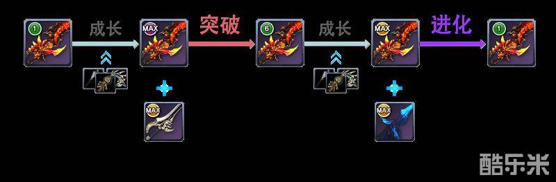 | 当成长装备成长至"5段最高"时,需要使用指定突破祭品进行突破,突破后可以达到6段。 |