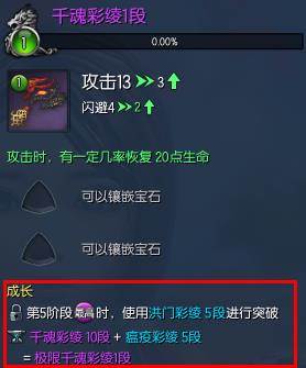 | 成长装备依靠"吃掉"祭品装备来获得装备经验,从1段至10段共有10个成长阶段。当成长装备成长至"5段最高"时,需要"突破祭品"来突破至6段;当成长至"10段"时,需要"进化祭品"进行装备进化,从而得到一件全新、拥有更大成长空间的装备 |