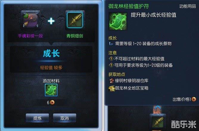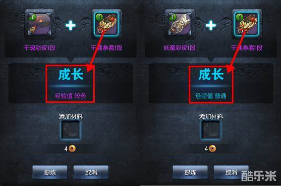 | 使用不同的成长祭品将会得到不同数量的经验值,并且花费也各不相同。 成长所需要的花费是根据成长祭品本身而定,同样的成长祭品在给任何成长装备使用时,花费永远相同。而成长装备所获得的经验值则需要根据成长装备和祭品装备各自的等级、级别和成长阶段而定。 |
