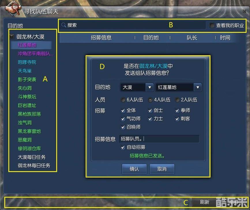 | 点击"刷新"可以刷新队伍信息。点击"招募"中可以发布队伍招募信息。 | ||