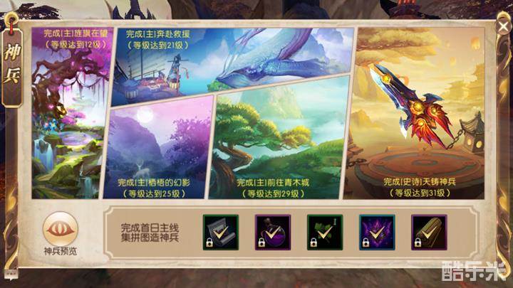 完成全部主线任务,到达31级后,可以领取神兵卷轴,并按照神兵任务获取所需合成道具。