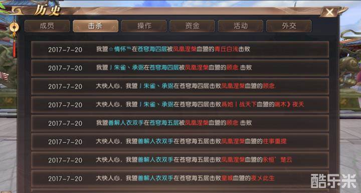 3、点击击杀,我们可以看到盟员击杀和被击杀的信息,包含了地点和对方的血盟名称。这个信息更新较快,可以在血盟的聊天信息内查看到这个信息。