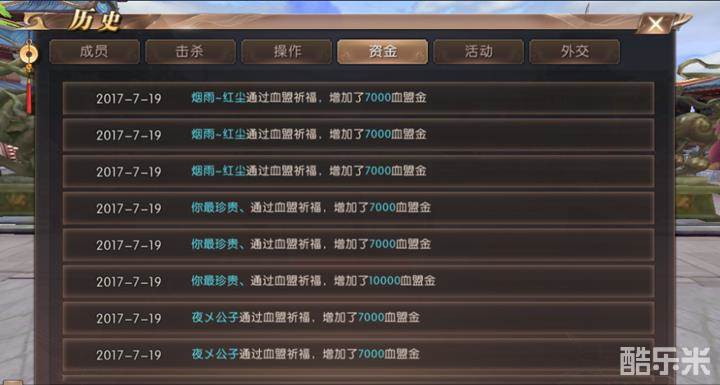 5、点击资金,我们可以看到近期盟员通过血盟祈福增加血盟金的情况。这个信息更新也较快,可以在血盟的聊天信息内查看到这个信息。