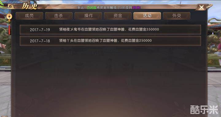 6、点击活动,我们可以看到血盟金用于血盟活动的花费情况,使每一笔血盟金花费都受到全盟的监督。