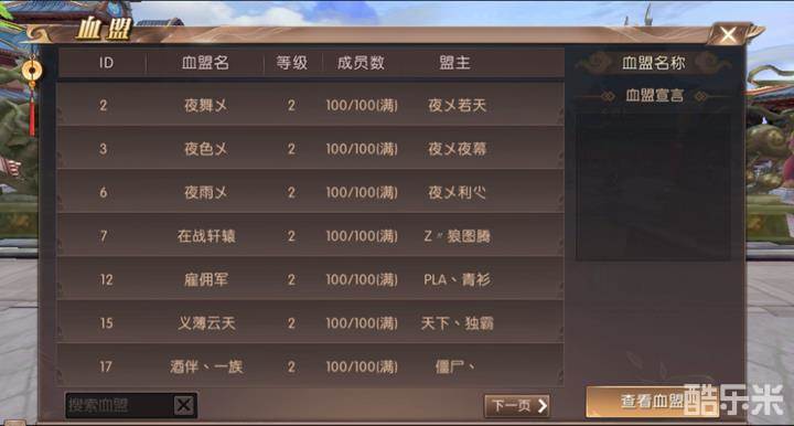 8、回到血盟界面,点击血盟界面信息下方的更多,打开血盟列表,我们可以看到其他血盟的名称、等级、成员数和盟主信息。