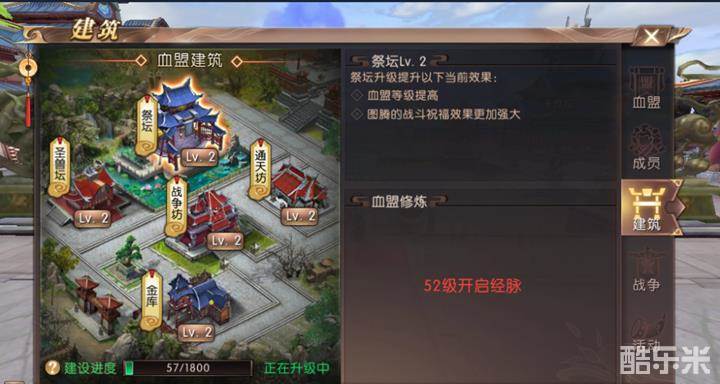 血盟建筑包含祭坛、圣兽坛、战争坊、通天坊、金库。
