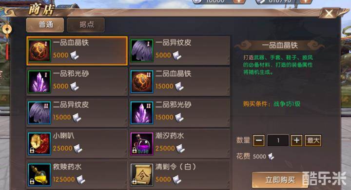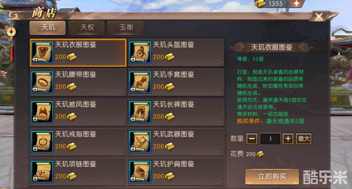 4、通天坊:通天塔挑战到相应层数,即可购买装备图纸。挑战层数越高,可购买的图纸等级越高。
