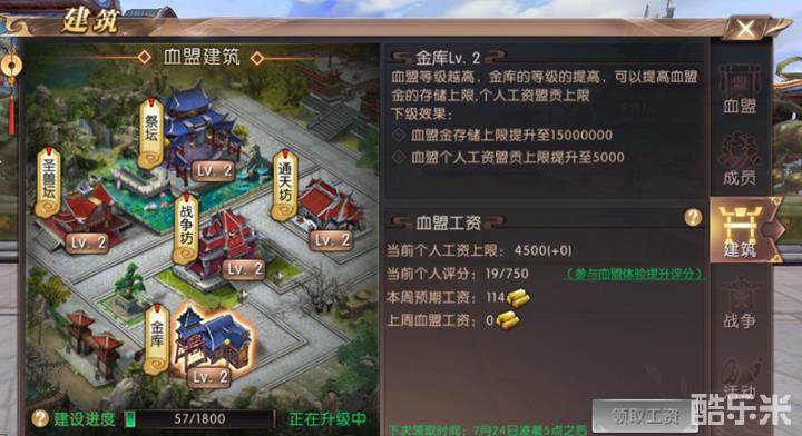 5、金库:升级金库,可以增加血盟金存储上限和个人工资盟贡上限。盟员每周都可以领取一次上一周的血盟工资。