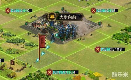 3、部队开始行军。部队向目的地出战需要一定的行军时间,行军时间与行军距离、武将属性有关,距离越小、武将速度越快,那么行军时间就越短。而且在部队行军的前三分钟内,玩家可以根据形势撤兵,部队撤兵武将可获得返还的10点体力;而三分钟之后,部队已经走远,所谓“将在外君命有所不受”,此时部队需要经历战斗才会返回了。