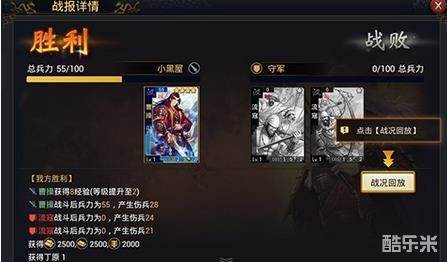 4、战斗结果显示,胜利并占据领地。部队到达目的地就会马上开始战斗,如果双方实力相差悬殊,战斗会马上结束,己方胜利就可将目的地占据,失败就会损失较多兵力,而无论胜负,武将都可获得经验。如果对战双方势均力敌,那么战斗结果会暂时显示“平局”,并在5分钟后进入下一轮对战,直到决出战斗胜负。玩家也可以在此5分钟之内增派援军到达目的地,帮助己方部队获得胜利。