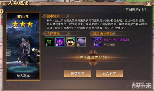 选择之后可以看到黎山之丘副本推荐战斗力为7200,这里推荐战斗力只作参考, 不用特别在意。下面还可以看到今日奖励和首次通关奖励,特别要说一下的是首次通关奖励,大家在做主线任务的时候会接到一个小的任务,要你通关黎山之丘,这个就是首次通关奖励的任务了,是会给到无双技的技能书的,所以大家记得要做这个任务哦。