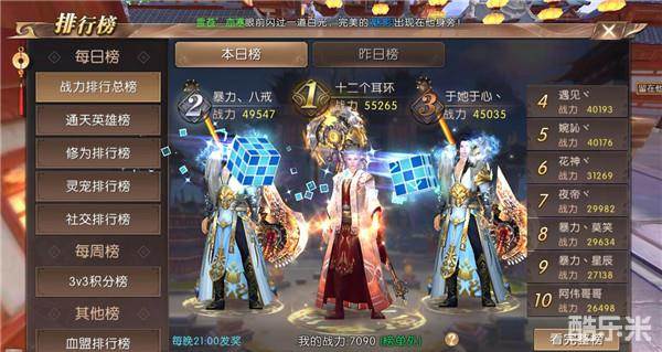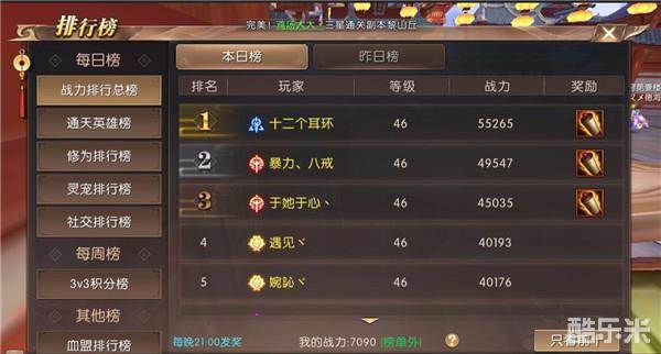 每日榜上分别有战力排行总榜、通天英雄榜、修为排行榜、灵宠排行榜、社交排行榜。除了本日榜,在它旁边还有昨日榜。勇士们可在界面下方观看自己是否进入榜单内,进入榜单内的前三名还会获得特殊的称号奖励(战力榜每日实时刷新,战力越高者排名越靠前,战力相同者,先到达者排名靠前)。