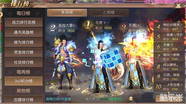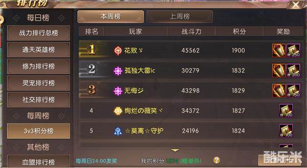 初进入3V3积分榜的界面可以看到中间三位排行前三的玩家的形象。一个个都是实力的代表啊。上方可以选择查看本周榜和上周榜。可以看出3V3积分榜是周榜制。右边可以看到4-10名的名字以及积分。在下方可以看到自己的积分和排行,以及每周奖励发放时间。