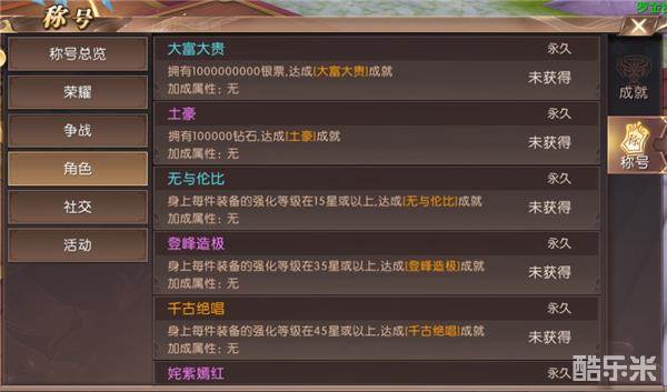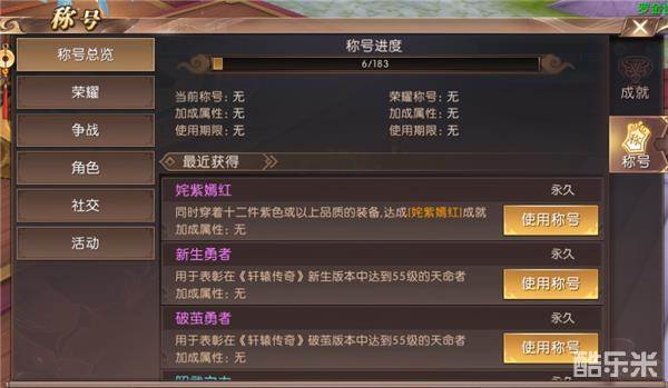 角色篇中首先出现的财富称号,大富大贵、土豪;其次是,装备成就的称号,无与伦比、登峰造极、千古绝唱、姹紫嫣红、武运昌盛;接着是器灵称号,澄清天下、九灵飞舞、十二灵动、十三太保;跟着是战力称号,昭武之力、忠武之力、骠骑之力、兵马之力、三军之力、轩辕之力;然后是咱们的技能修为的称号,无招胜有招、出神入化;以及咱们经脉的称号,任督顿开、奇经八脉、醍醐灌顶、阴阳调和;还有咱们坐骑的称号,驯兽大师、风驰电掣等等等。咱们在平时的时候可以通过,其他轩辕勇士在头上挂的称号来粗略判断,这个小伙伴在哪方面是比较突出的,同时也可以让我们在交手的时候做到心中有数。