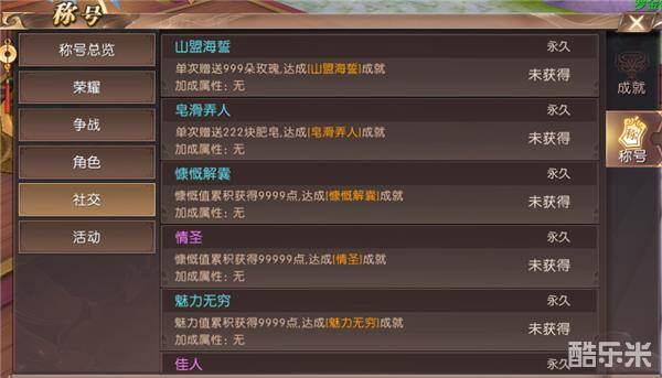 在社交篇中介绍的是勇士们的魅力以及慷慨情况等。如,山盟海誓、皂滑弄人、慷慨解囊、情圣、魅力无穷、佳人等。社交篇的称号主要是通过玫瑰跟肥皂来获取到的,这也表现出了勇士们在轩辕传奇手游中的魅力跟社交魅力。