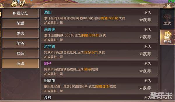 活动篇中,主要介绍的是使用灵酒(酒仙)、血盟捐献(慈善家)、主线任务完成度(游学者)、地宫刷怪(刷子)、藏宝图的挖取(倒霉蛋、衰神)、师门任务(大师兄)、血盟领导力(领导有方)这些方面的成就称号。
