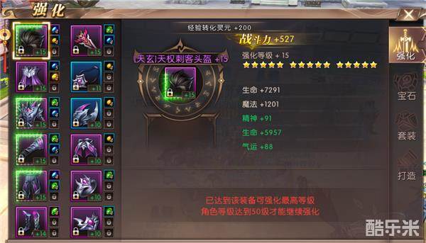 装备强化到5级、15级、30级会各开放一个宝石孔,目前还没有开放50级,所以目前大家所穿戴的装备最高只能强化到15星,也就是最多可以镶嵌两颗宝石。后面会开放更高的装备强化等级。