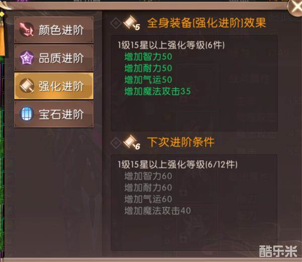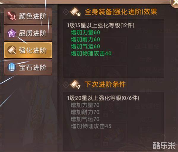 全身装备强化达到一定等级之后会激活全身装备[强化进阶]效果,效果分等级,每个等级要求逐级递增,当然所加的属性也是逐级增多的。所以大家强化装备的时候,可不要只盯着一件强化,可以全身装备一起强化,来激活这个效果。
