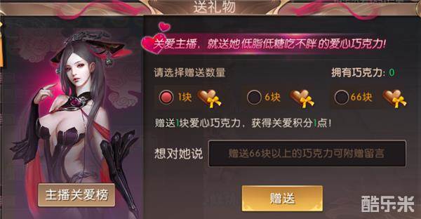 在主播频道上方,有一个礼物的图标,点开即可看到主播专属礼物,爱心巧克力。喜欢哪个主播就为她送上巧克力吧。一次赠送66块以上还可以留言给你喜欢的主播哦。