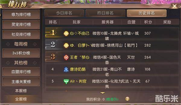同时在这边也可以看到,有一个小小的排行榜,主播关爱榜。也就是赠送主播礼物的玩家的一个排行榜。打开排行榜,可以看到今日排名,昨日排名和历史排名。同时在左边还可以看到有本服榜和全服榜。会显示那些赠送给主播礼物的玩家的排名和积分。
