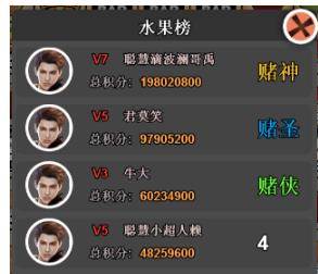 这是水果榜,也就是在水果机玩法中赚钱最多的玩家。第一名为赌神,第二名赌圣,第三名赌侠。