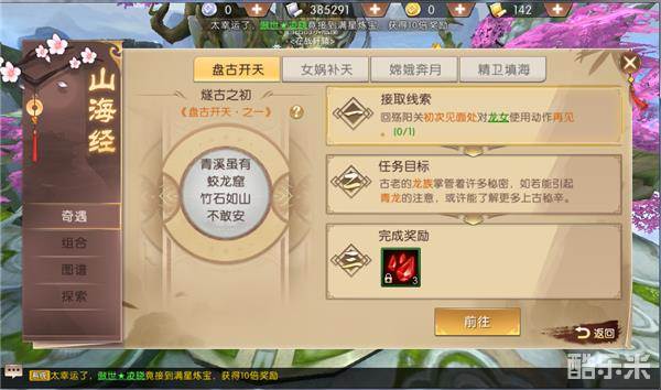 完成接取线索,就可以接取任务了。这时候追踪任务有2个方式,一个是直接点左侧的任务栏,还一个是点开山海经页面,在页面下侧点击前往也是可以的。轩辕的勇士可以根据自己的喜欢和方便进行选择,相信这些都难不住我们的轩辕勇士。
