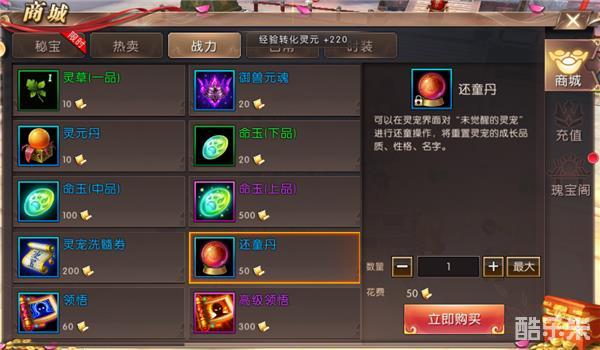 还童丹,每个售价50金票。用于重置灵宠的成长品质,资质和性格。45级之后可以选择只重置资质。拥有一个好宠物的必要道具。好的宠物会为你带来很高的站立提升哦。