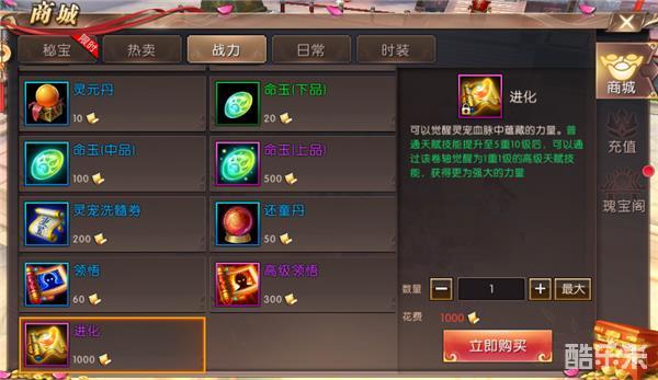 领悟,高级领悟,进化,依旧是宠物道具。领悟每个售价60金票,高级领悟每个售价300金票,进化每个售价1000金票。领悟用于提升宠物的普通天赋技能等级,普通天赋技能提升至5重10级后,可以使用进化卷轴来觉醒为1重1级的高级天赋技能。高级天赋技能需要使用高级领悟来升级。天赋技能是很有用的技能,提升的等级越高对自身帮助越大。
