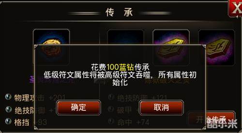 3、如果传承和被传承的符文等级不同(橙色>紫色>蓝色),则传承时,低级符文可以向高级符文传承,需要花费100蓝钻,传承后,高级符文具备低级符文的属性,低级符文的属性初始化,包括所具有的属性条数也初始化为1条,属性随机。
