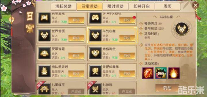 斗战心魔玩法要求等级要30级以上才会触发,当我们的等级与相对的地图等级相匹配的时候,只要处于苍穹海、昆仑墟、孽龙囚和葬魂谷等地宫地图进行刷怪,一旦我们的手机突然震动那八成就是心魔出现了,所以勇士们在地宫刷怪最喜欢的竟然就是手机莫名其妙的震动。