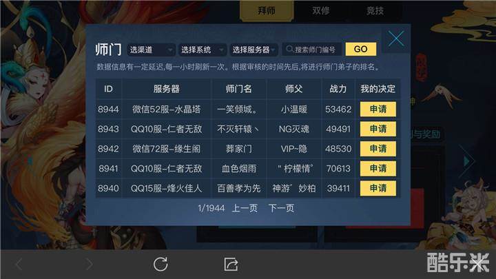 许多新手勇士在初玩轩辕传奇手游的时候,都会有点迷茫,经常做一些吃力还不加战力的事情。那么,找个老司机带着一起玩,无疑是个好选择。师徒双修这个活动,就为勇士提供了很多便利。勇士可以点击活动页面,拜师,拜入师门。点开后,会看到许多师门信息。师门信息透露了,师门名、师门所在服务器,师父昵称和师父的战力。勇士可以根据自己的喜好来选择师门哦。比如喜好这个师门名,师父战斗力高,师父昵称喜欢、师门在同一个服务器。
