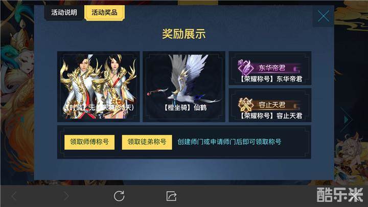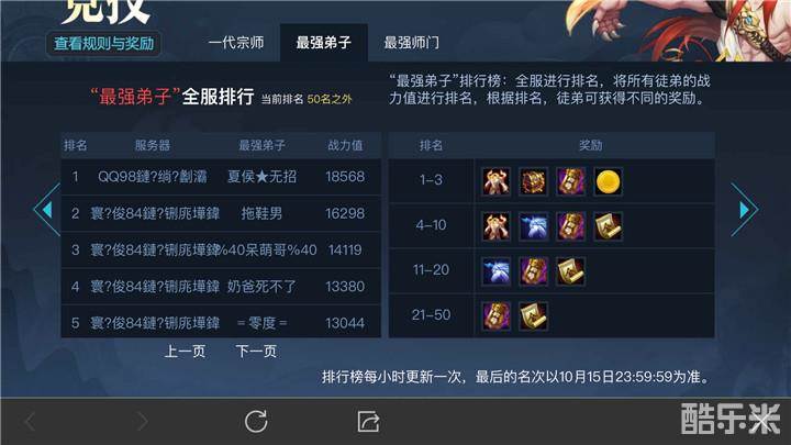 “最强弟子”将所有徒弟的战力值进行排名,前50名徒弟可以获得一定的奖励,比如无量天尊时装、仙鹤或银铃金角坐骑、荣耀称号、QB、金票等。