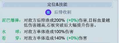 泥巴爆弹:对敌方后排造成200%+伤害,目标血量越低伤害越高。