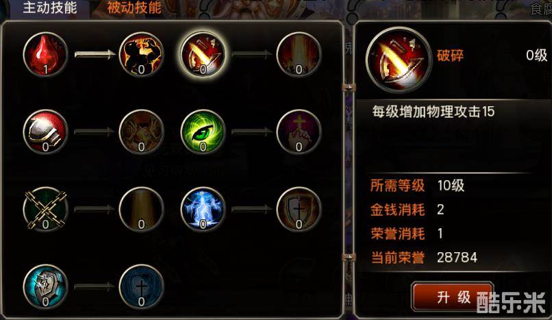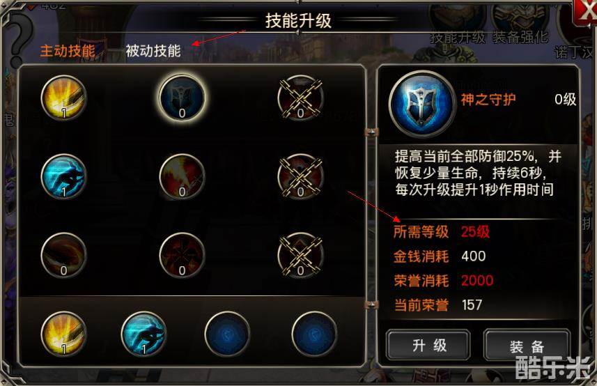 升级任何技能均会为角色带来技能效果增益以及属性增益,也均需要消耗一定金钱和荣誉,技能等级越高消耗越大,技能等级不能超过人物等级。
