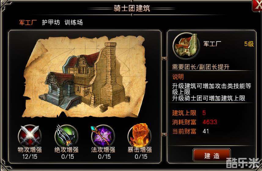 2、 骑士团激活/提升相应骑士团建筑(需团长/副团长激活,需消耗骑士团财富),骑士团建筑等级不得超过骑士团等级,每提高一级骑士团建筑等级,相应建筑的技能等级上限提高3。