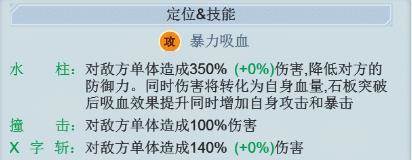 技能水柱:对敌方单体造成350%+X%的伤害,降低对手的防御力。同时伤害转化为自身血量,石板突破后吸血效果提升增加自己攻击和暴击。