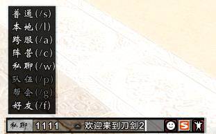 当您进入刀剑2后,在游戏画面左下角的位置就是“游戏聊天框”了,在聊天框里可以显示各个频道的玩家对话