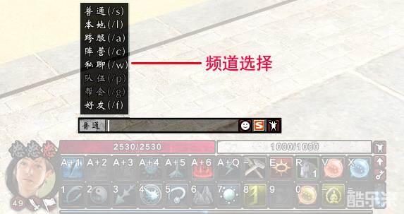 1)聊天的输入框在人物属性技能框的上面,如图4所示,选择频道,您可以在不同频道发布信息