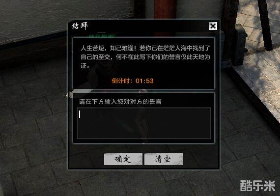 结拜开始时将会扣除50银绑定刀券,开始结拜后,写下结拜的誓言确认后即可完成结拜,结拜后获得结拜称号。