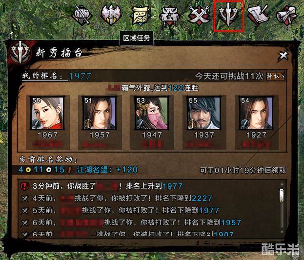 当玩家等级到达19级之后,会自动接取一个“【教学】江湖新秀”系列任务。玩家完成这个任务之后,屏幕右上角会出现一把剑的标志,点击该标志即可进入新秀擂台挑战。